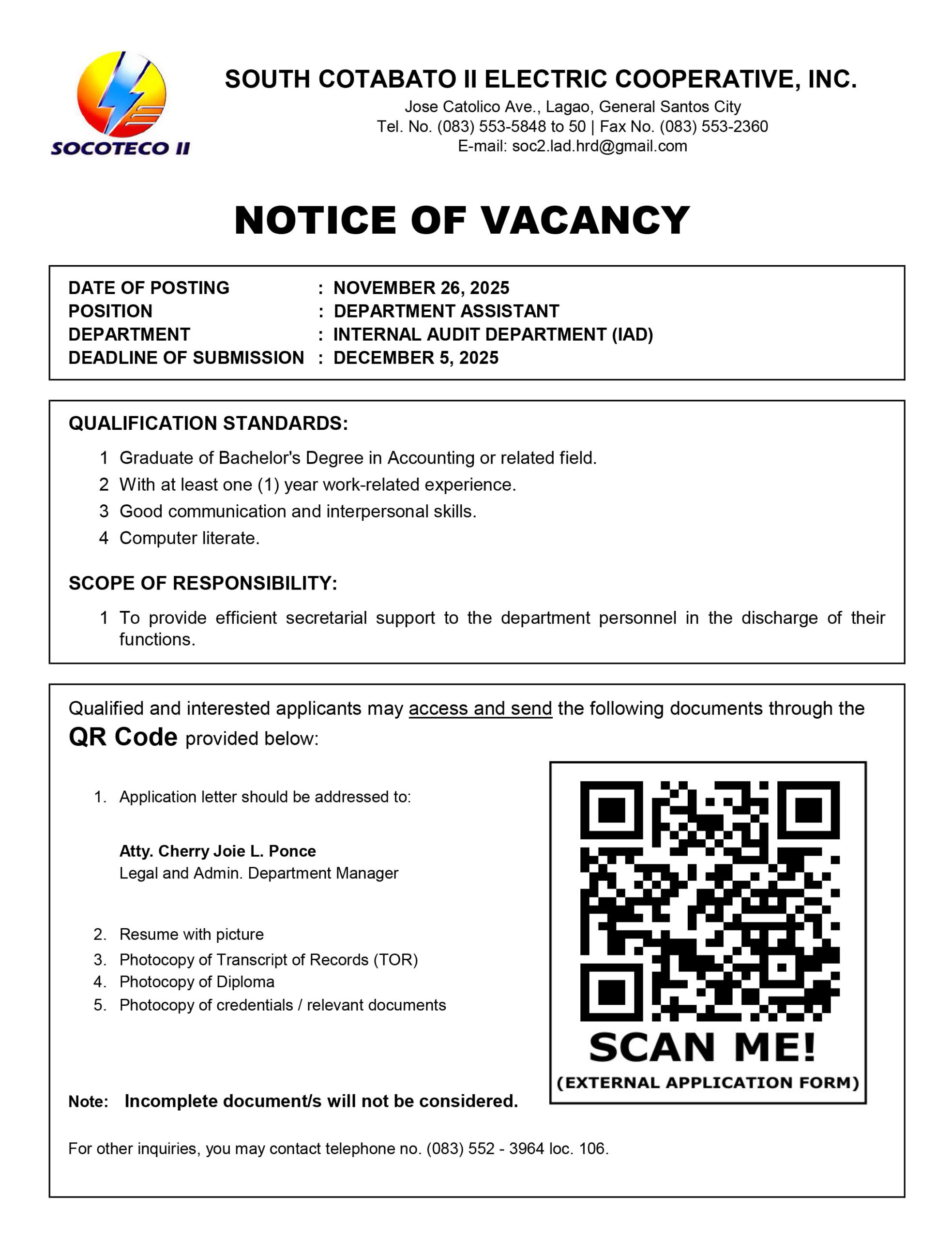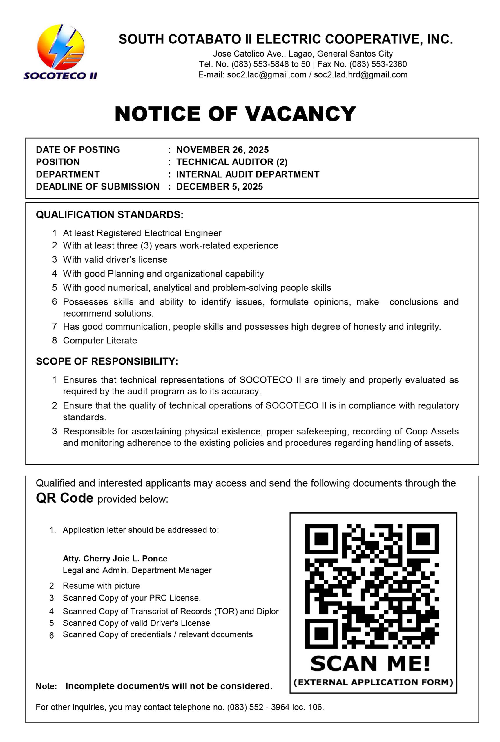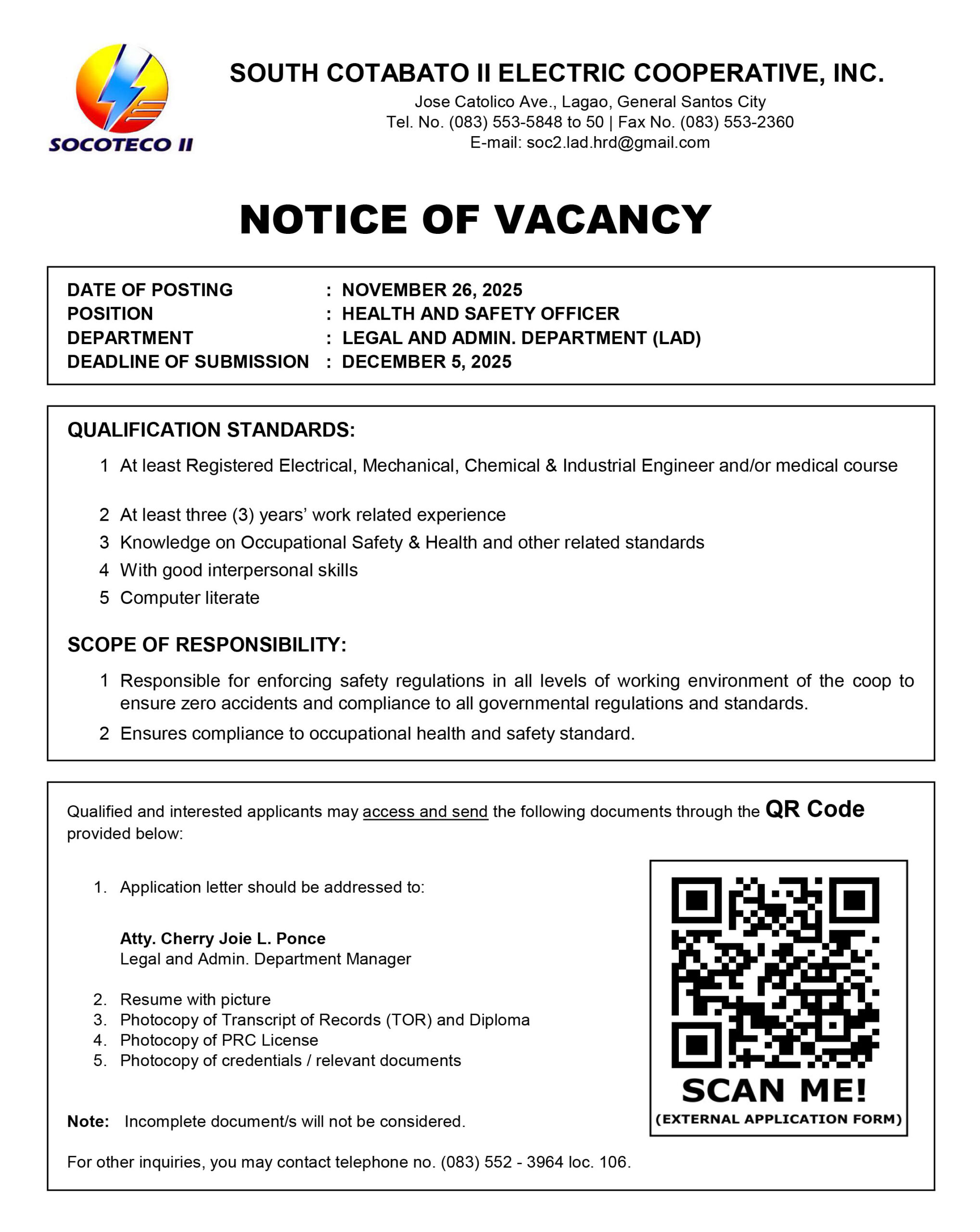 Socoteco II : // Home // News And Updates // NOTICE OF VACANCY – Novembe...