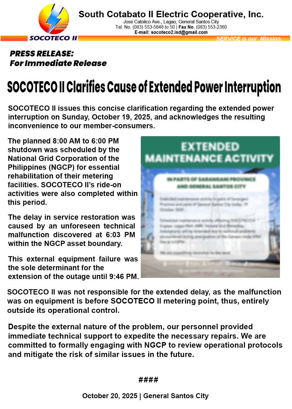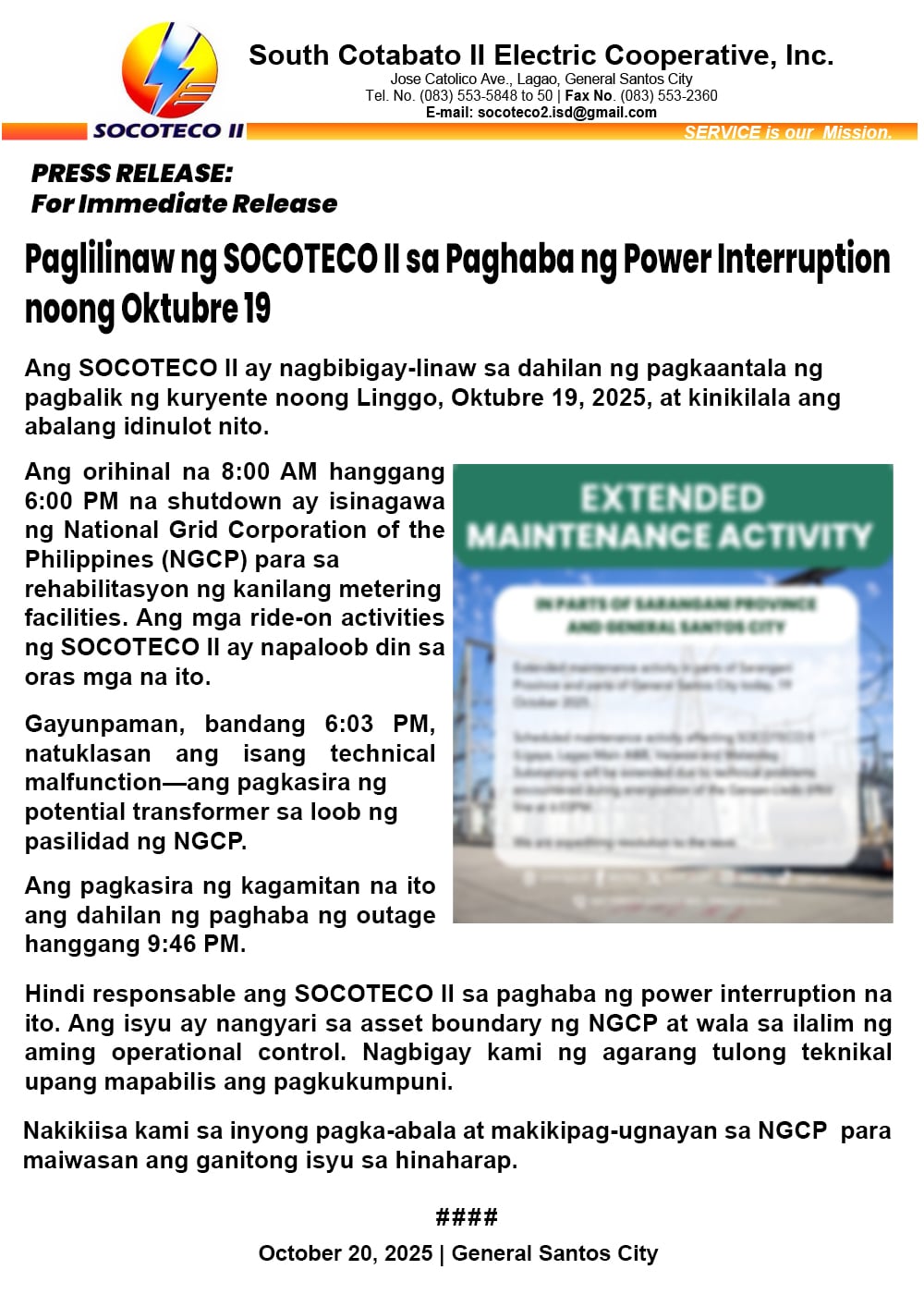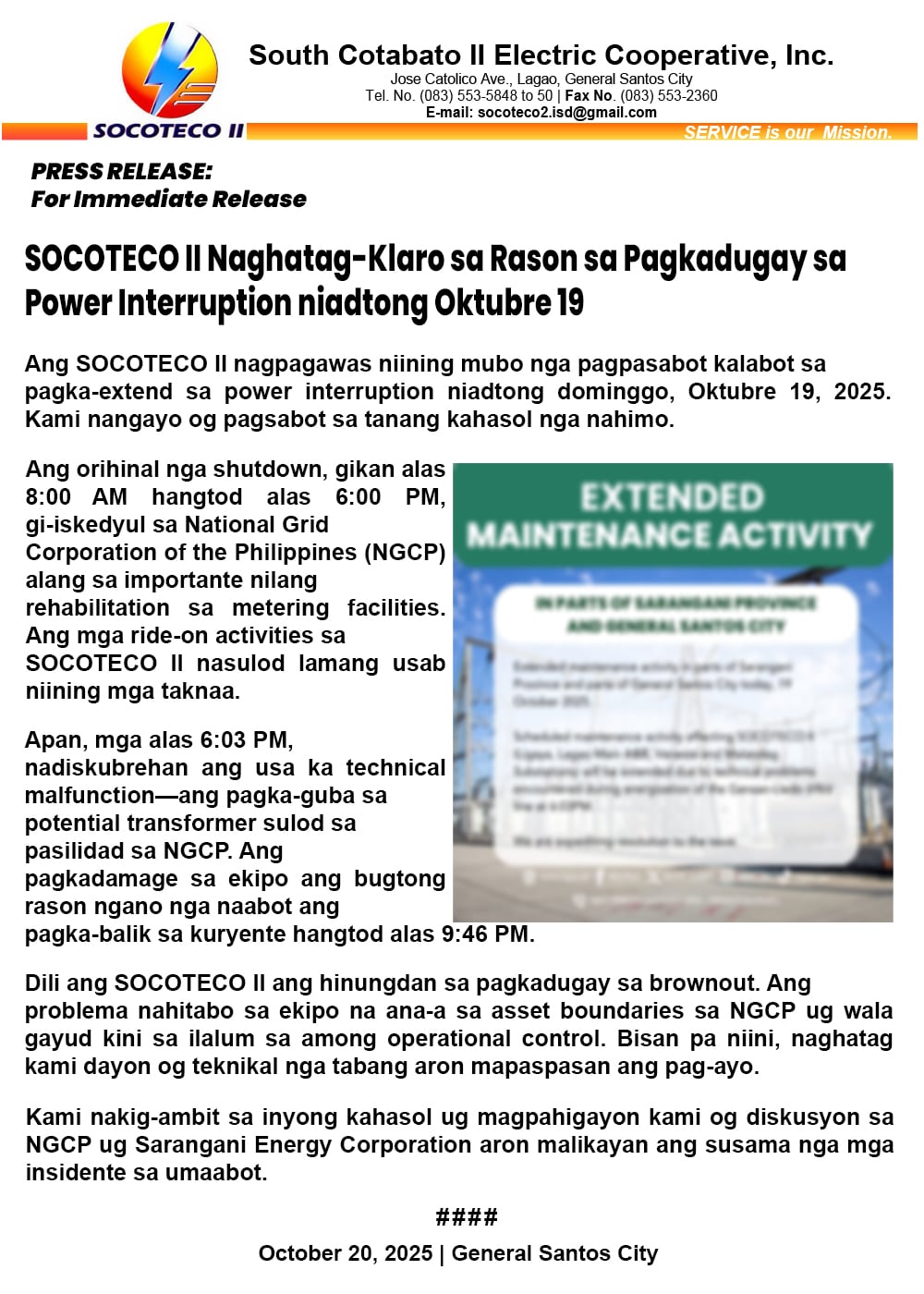 Socoteco II : // Home // News And Updates // PRESS RELEASE – Octob...