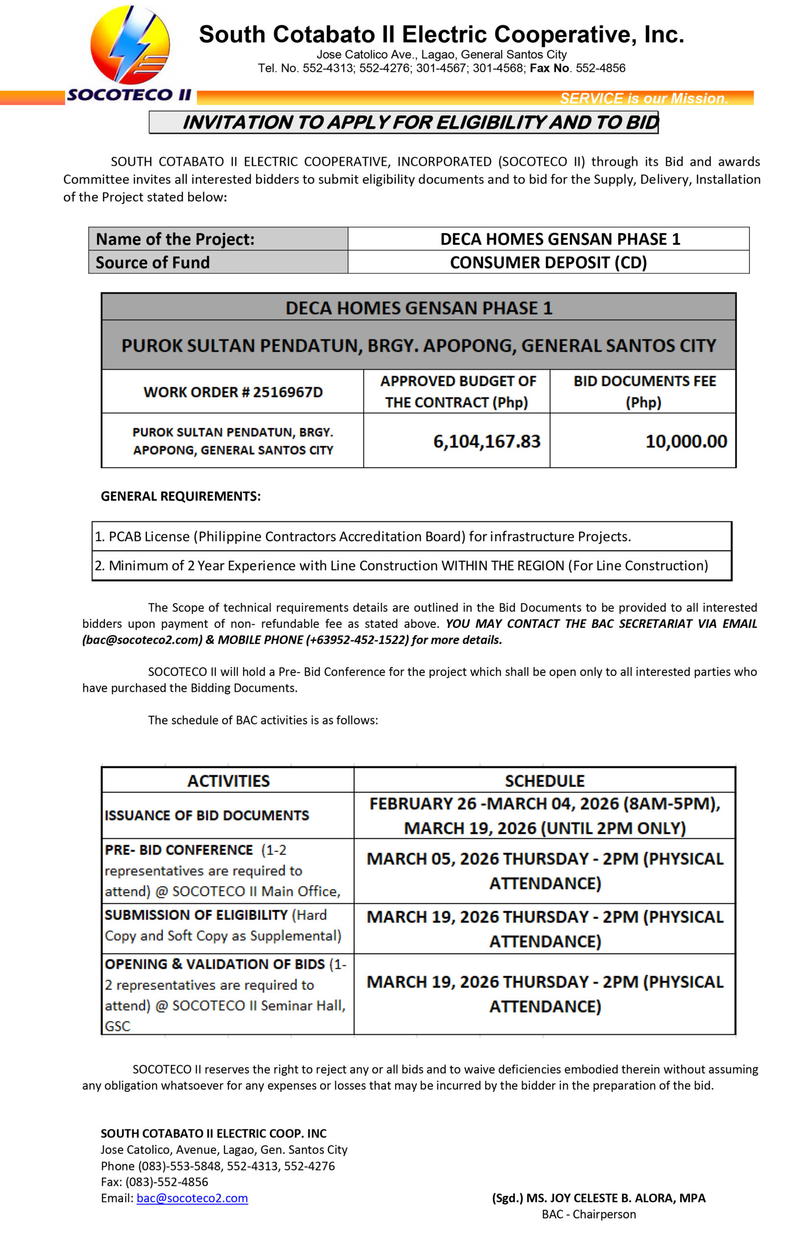 INVITATION TO APPLY FOR ELEGIBILITY AND TO BID – LINE CONSTRUCTION OF DECA HOMES GENSAN PHASE 1